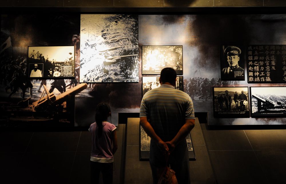 2013年8月15日,吉林省長(zhǎng)春市各界人士來(lái)到位于偽滿皇宮博物院內(nèi)的東北淪陷史紀(jì)念館,參觀日本侵略中國(guó)東北史實(shí)展覽,緬懷抗戰(zhàn)英烈。這是一對(duì)父女在參觀展覽。