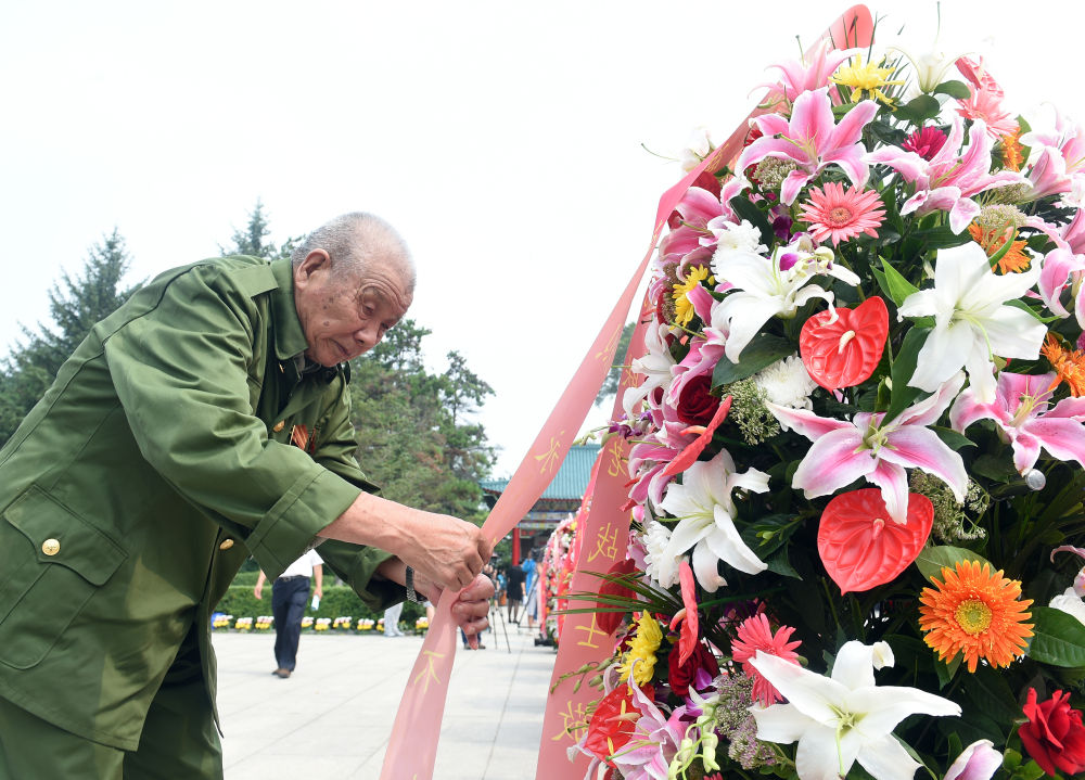 2015年8月15日,吉林省紀(jì)念東北抗聯(lián)精神大會(huì)在吉林通化舉行,各界群眾來(lái)到通化市楊靖宇烈士陵園,緬懷犧牲的東北抗聯(lián)將士。這是一位東北抗聯(lián)老戰(zhàn)士為烈士敬獻(xiàn)花圈。