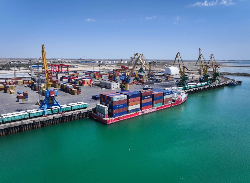 8月6日,一艘貨輪停靠在哈薩克斯坦阿克套港(無人機照片)。新華社記者 李任滋 攝