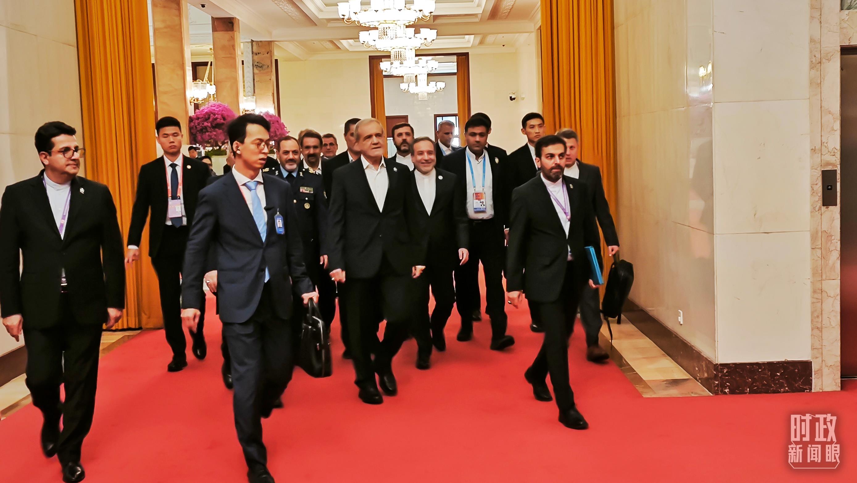 △伊朗總統(tǒng)佩澤希齊揚(yáng)走向會(huì)見(jiàn)廳。(總臺(tái)國(guó)廣記者蔡靖骉拍攝)