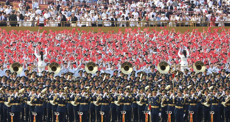 紀念大會開始前,天安門廣場上,千人聯(lián)合軍樂團演奏四首歌曲,合唱團唱響《松花江上》《在太行山上》《保衛(wèi)黃河》《沒有共產(chǎn)黨就沒有新中國》。
