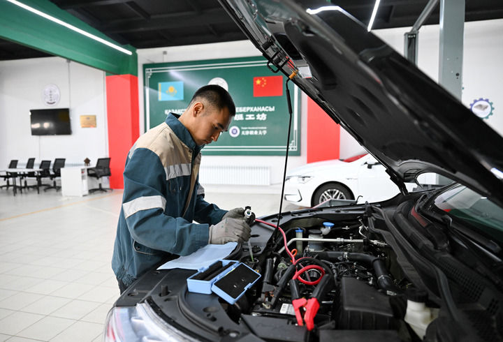 2025年5月9日,在哈薩克斯坦東哈薩克斯坦州首府厄斯克門的魯班工坊,學(xué)員練習(xí)汽車檢修技能。 新華社記者 李任滋 攝