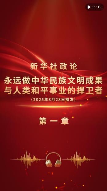 新華社8月28日播發(fā)《新華社政論|永遠做中華民族文明成果與人類和平事業(yè)的捍衛(wèi)者——寫在中國人民抗日戰(zhàn)爭暨世界反法西斯戰(zhàn)爭勝利80周年之際》。我們邀請誦讀嘉賓任志宏演播“第一章”。