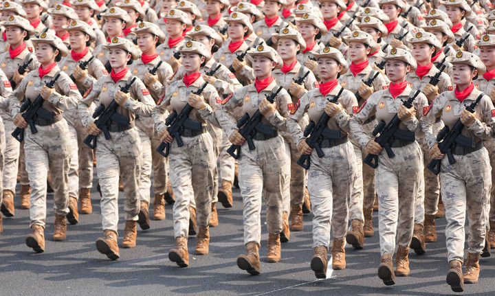 9月3日,天安門(mén)廣場(chǎng)。身著蛙式作訓(xùn)服、手握鋼槍的女民兵,身姿挺拔、英姿颯爽。她們來(lái)自當(dāng)年的主要抗日根據(jù)地。這是民兵首次亮相以紀(jì)念抗戰(zhàn)為主題的閱兵活動(dòng)。