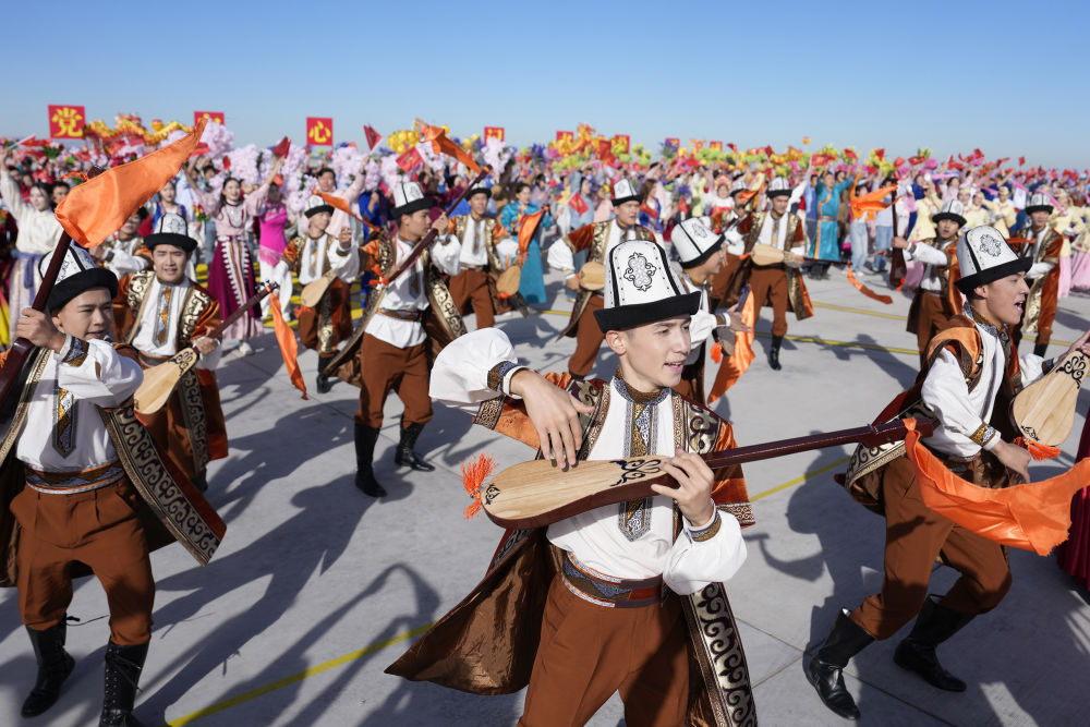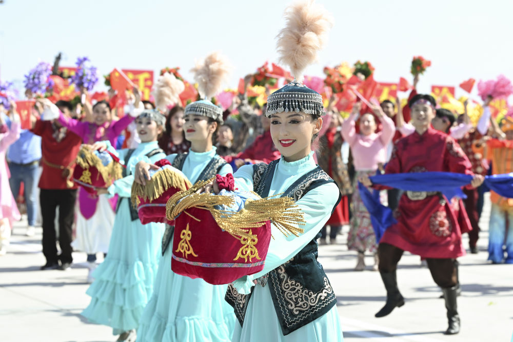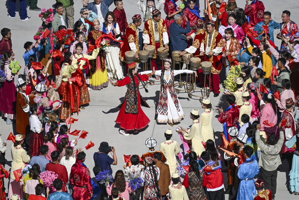 新華社記者的鏡頭里,各族兒女簇?fù)碓谝黄?,歡笑在一起;明艷的服飾、熱烈的歌舞,無不展現(xiàn)出團(tuán)結(jié)與奮進(jìn)的力量。
