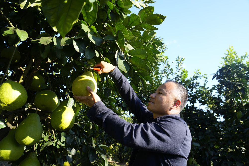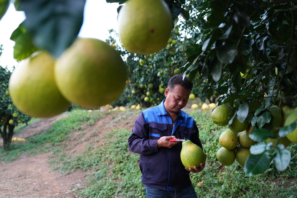 2025年11月7日,柚農(nóng)在梅州南福金柚種植基地采摘柚子。