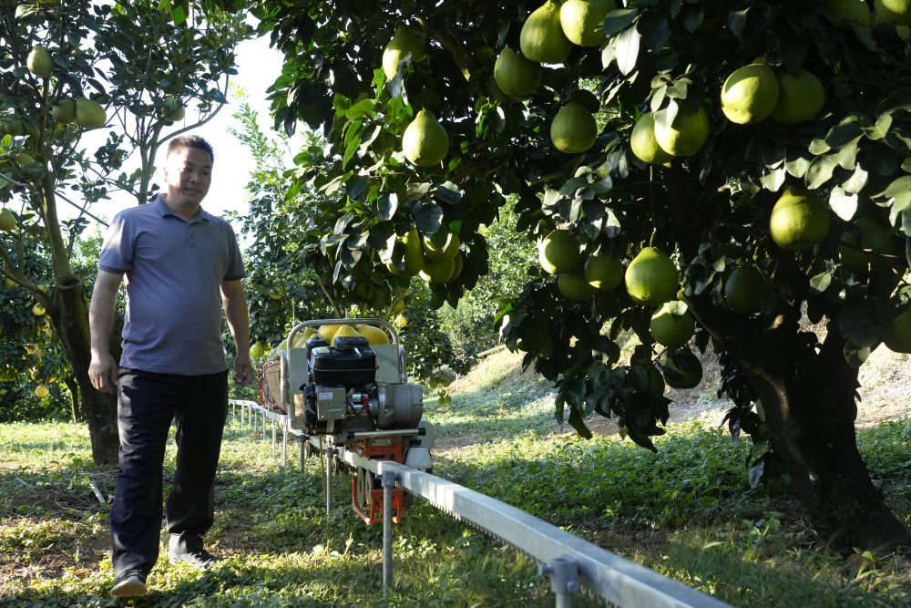 2025年11月7日,在梅州南福金柚種植基地,柚農(nóng)通過山地運(yùn)輸車運(yùn)輸柚子。