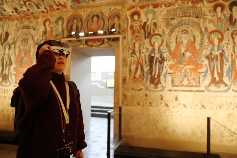 2025年10月30日,在敦煌石窟文物保護研究陳列中心,游客使用AR設備在復制洞窟參觀體驗。