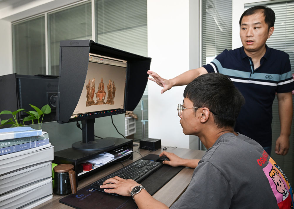 2023年8月3日,敦煌研究院文物數(shù)字化研究所的工作人員在展示莫高窟彩塑三維重建的成果。近年來,敦煌研究院持續(xù)加大文物保護基礎研究和應用研究,不斷加強文物科技保護力度,提升科研平臺建設,為文物保護和文化遺產(chǎn)事業(yè)發(fā)展奠定良好基礎。
