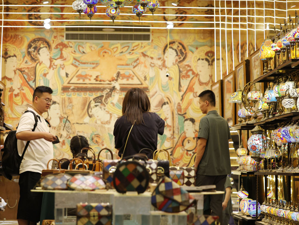 2025年6月26日,游客在敦煌夜市選購文創(chuàng)產(chǎn)品。今年以來,敦煌市全面改造敦煌夜市等特色街區(qū),圍繞敦煌深厚的歷史文化底蘊,融入壁畫、絲路文化等元素,通過布設文化景觀小品、打造沉浸式餐飲體驗空間、上線特色文創(chuàng)產(chǎn)品等方式,給游客帶來多元體驗,“夜經(jīng)濟”持續(xù)升溫,不斷釋放文旅消費潛力。