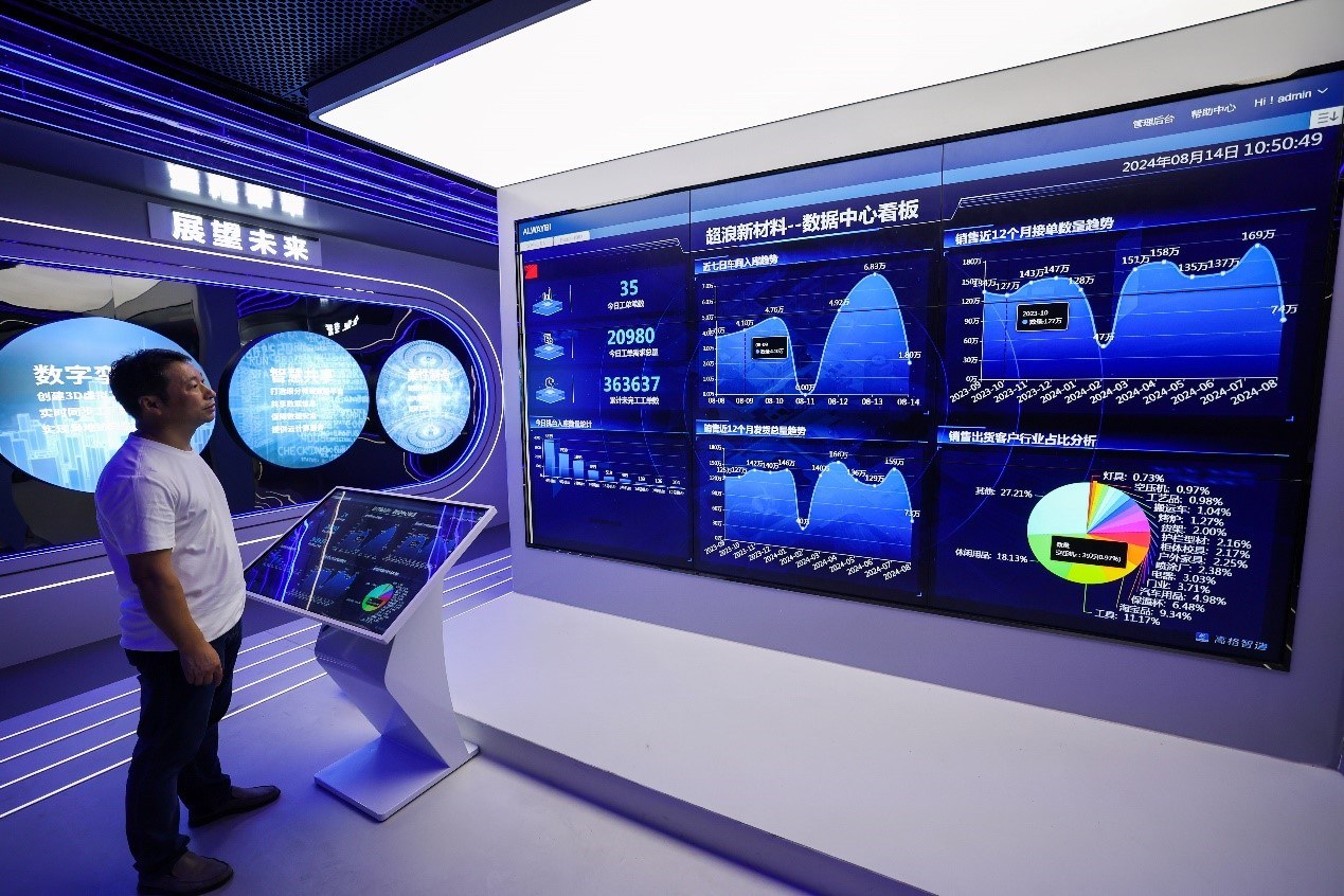 在金華市金東區(qū)江東鎮(zhèn)的浙江超浪新材料有限公司內(nèi),數(shù)據(jù)中心看板實(shí)時(shí)顯示企業(yè)流水線的各項(xiàng)生產(chǎn)數(shù)據(jù)。新華社記者 徐昱 攝