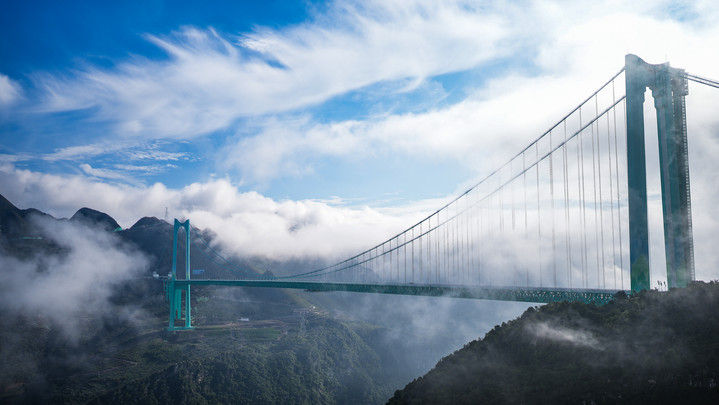 2025年9月28日,世界第一高橋——貴州花江峽谷大橋建成通車。花江峽谷大橋是貴州六枝至安龍高速公路的控制性工程,大橋全長(zhǎng)2890米,主跨徑1420米,是目前世界山區(qū)峽谷第一大跨度鋼桁梁懸索橋;其橋面距水面垂直高度625米,是新的世界第一高橋。