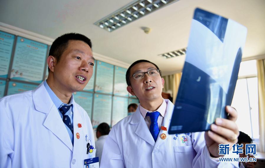 2017年8月3日,在拉薩市人民醫(yī)院骨科病房,北京積水潭醫(yī)院的援藏醫(yī)生龔曉峰(右)和北京天壇醫(yī)院援藏醫(yī)生李家謀查看患者的X光片。 新華社記者 晉美多吉 攝