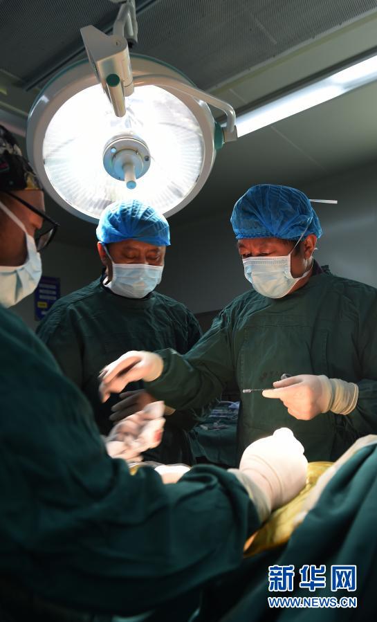 2017年5月26日,援藏醫(yī)生李家謀(右)帶領(lǐng)拉薩市人民醫(yī)院的藏族醫(yī)生進(jìn)行微創(chuàng)脊柱手術(shù)。 新華社記者 覺果 攝