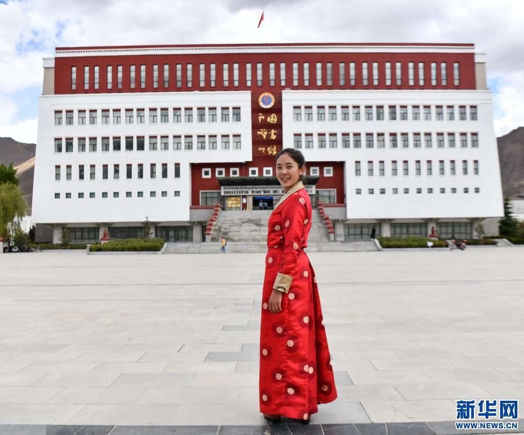 拉增在西藏大學圖書館前留影(5月7日攝)。新華社記者 晉美多吉 攝
