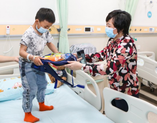 鄧?yán)蚋敝魅我恍锌赐藖碛逯委煹?5位患兒,并為他們送上嶄新的書包和文具。并與患兒家長熱情交談,詳細(xì)了解患兒恢復(fù)情況?;純杭覍俅碜楷敽屯贩謩e向重慶市衛(wèi)健委和重醫(yī)附屬兒童醫(yī)院贈送了錦旗,并獻(xiàn)上了潔白的哈達(dá)表示感謝。