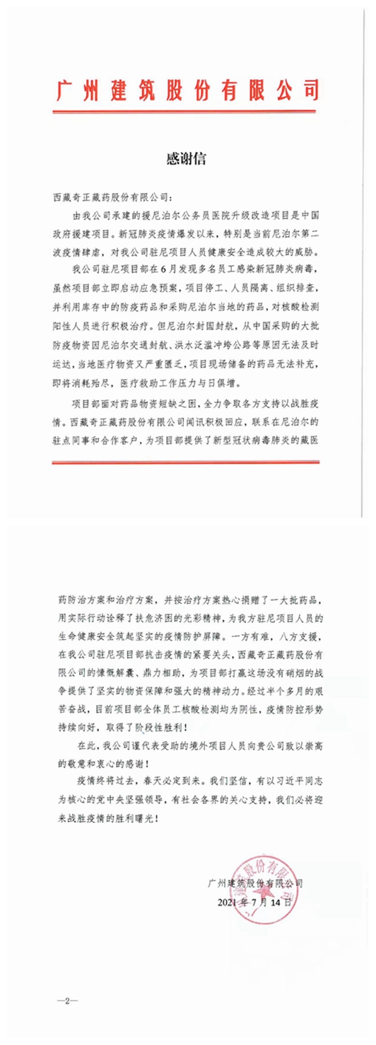 患者經(jīng)多次核酸檢測(cè)轉(zhuǎn)陰未復(fù)陽(yáng)后,廣州建筑集團(tuán)特地給西藏奇正藏藥股份有限公司寫(xiě)了一份感謝信,信中寫(xiě)到:西藏奇正藏藥股份有限公司為項(xiàng)目部提供了新型冠狀病毒肺炎的藏醫(yī)藥防治方案和治療方案,并按治療方案熱心捐贈(zèng)了一大批藥品,用實(shí)際行動(dòng)詮釋了扶危濟(jì)困的光彩精神,為我方駐尼項(xiàng)目人員的生命健康安全筑起堅(jiān)實(shí)的疫情防護(hù)屏障。一方有難,八方支援,在我公司駐尼項(xiàng)目部抗擊疫情的緊要關(guān)頭,西藏奇正藏藥股份有限公司的慷慨解囊、鼎力相助,為項(xiàng)目部打贏這場(chǎng)沒(méi)有硝煙的戰(zhàn)爭(zhēng)提供了堅(jiān)實(shí)的物資保障和強(qiáng)大的精神動(dòng)力。