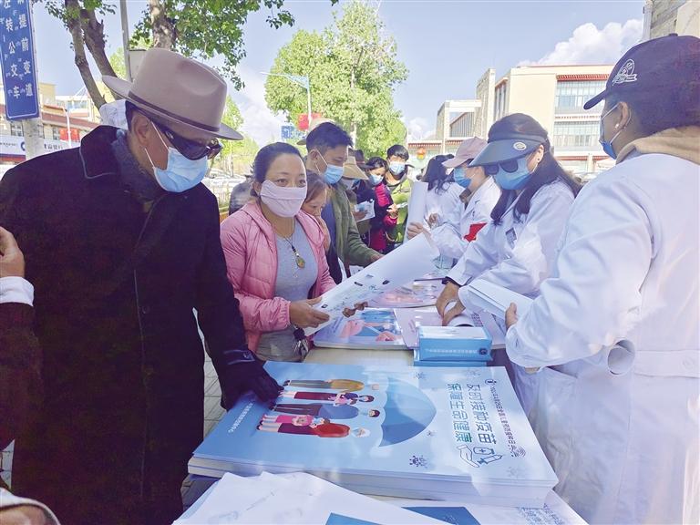 西藏自治區(qū)疾控中心工作人員向過往市民發(fā)放宣傳冊。記者 芮怡星 攝