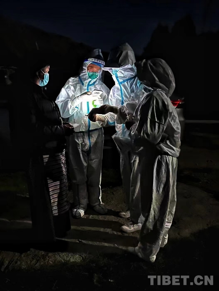 圖為8月13日凌晨,瓊結(jié)縣藏醫(yī)院醫(yī)護(hù)人員在白馬林小區(qū)進(jìn)行核酸采樣工作