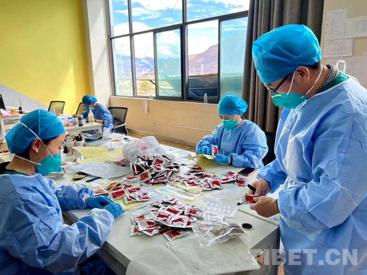 圖為拉薩市第二座方艙醫(yī)院藥劑科醫(yī)護(hù)人員們?yōu)樾氯腭v的患者準(zhǔn)備藏藥 攝影:次仁卓瑪