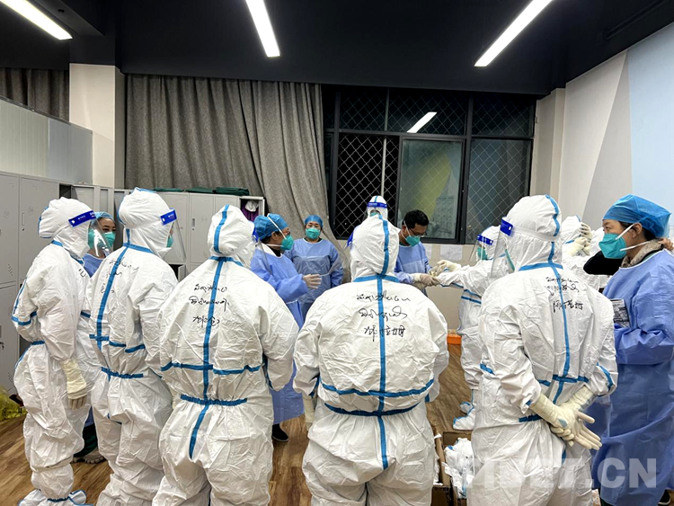圖為拉薩市第二座方艙醫(yī)院醫(yī)護(hù)人員們正在穿防護(hù)服準(zhǔn)備開始一天的工作 攝影:次仁卓瑪