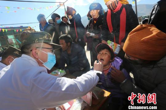 武警西藏總隊醫(yī)院巡診小分隊官兵在為林周縣覺布村的兒童檢查口腔。 余文彬 攝