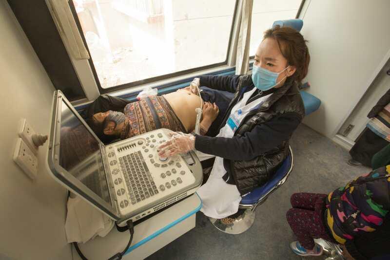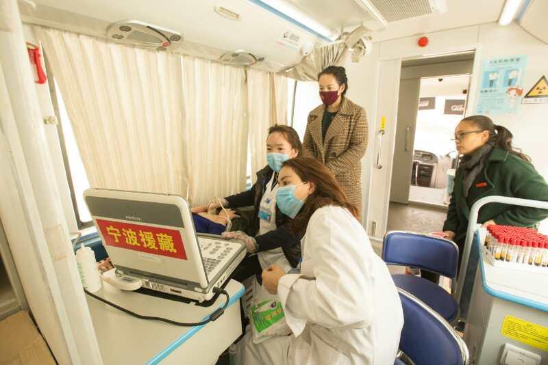一輛八米多長的農(nóng)牧民健康體檢車按照年度計劃,穿梭于比如縣的大小鄉(xiāng)村。車上載有先進(jìn)的DR(數(shù)字影像攝片機(jī))、便攜彩超機(jī)、心電圖機(jī)、便攜檢驗設(shè)備。這臺車是浙江省援藏副指揮長、比如縣委常務(wù)副書記盛悠聯(lián)系寧波市江北區(qū)政府捐贈的。在第八批寧波紹興援藏工作組干部的精心設(shè)計下,專門向宇通公司定制的一輛功能齊全的大巴體檢車,光車底和改裝費(fèi)用就達(dá)73萬元。它與普通體檢車需要接入停泊地市電、自來水才能運(yùn)行不同,寧波的援藏干部根據(jù)西藏鄉(xiāng)村缺電少水的現(xiàn)狀,多方咨詢方案,最后增加了價值十萬元的高壓電容設(shè)備,實現(xiàn)了通過車載的小型發(fā)電機(jī)帶動50千瓦的DR,并可連續(xù)運(yùn)轉(zhuǎn),這在全國尚屬首例。車上還配備主動式抽水泵,解決上水問題,并配有空調(diào)系統(tǒng)。車子開到哪里,便可不靠外力,進(jìn)行包括拍攝X光片、彩超、心電、檢驗等的全面健康體檢,許多鄉(xiāng)鎮(zhèn)衛(wèi)生院也不如這輛體檢車的配置強(qiáng)大。