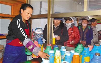 沖賽康“愛(ài)心飯館”位于拉薩老城區(qū)核心地帶,因“愛(ài)心飯館”飯菜量足、甜茶味道好,深受廣大居民群眾的喜愛(ài)。記者來(lái)到?jīng)_賽康“愛(ài)心飯館”時(shí),飯館內(nèi)早已座無(wú)虛席,每個(gè)窗口前都排滿(mǎn)了人,廚房?jī)?nèi)的工作人員更是忙得不可開(kāi)交?!疤鸩枰呀?jīng)賣(mài)完了,請(qǐng)稍等一會(huì)兒,我們馬上做?!狈?wù)員向客人說(shuō)道。