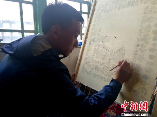 17日,古城拉薩八廓街一古建大院的一角,晉美和他的師兄盤腿而坐,專注著眼前的畫板,不時翻著手邊《四部醫(yī)典系列掛畫全集》的圖冊,藏醫(yī)藥典籍中的人體骨骼、脈絡(luò)在他們的筆下栩栩如生。