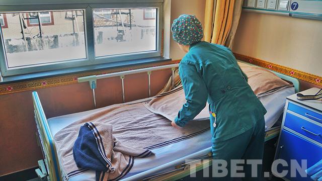 圖為護(hù)理人員正在為病人鋪床,患者浴后需要躺臥發(fā)汗
