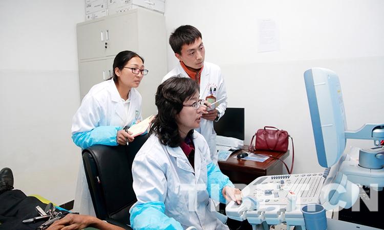 首都醫(yī)科大學(xué)附屬北京天壇醫(yī)院超聲科的何銀鳳給當(dāng)?shù)氐尼t(yī)護人員演示超聲檢查基本操作。攝影:陳衛(wèi)國