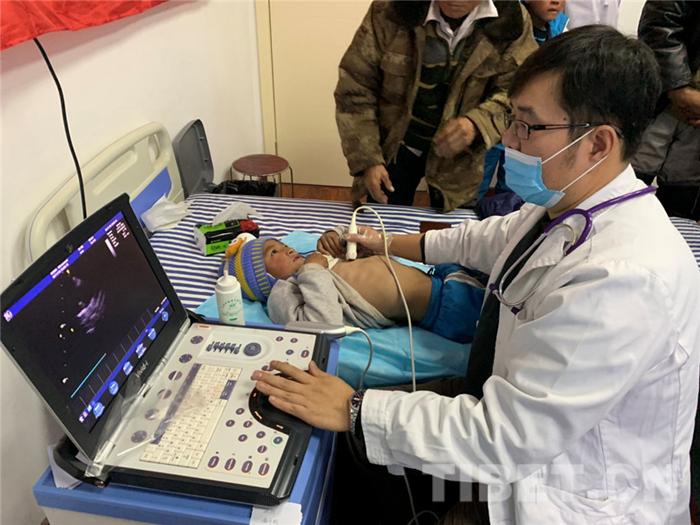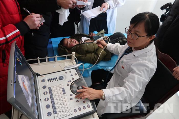 會議一結(jié)束,工作組就前往本次先心病篩查的第一站——昌都市卡若區(qū)人民醫(yī)院。這次來昌都確篩的孩子,都是西藏大學(xué)醫(yī)學(xué)院和當?shù)蒯t(yī)院初篩過的先心病疑似患兒。面對樓道里排起長隊等待檢查的孩子們,安貞醫(yī)院小兒心臟內(nèi)科副主任王霄芳只說了一句“哪怕是經(jīng)過聽診沒有問題的孩子,也最好讓他們在這里排隊等著檢查,”便一邊脫外套一邊走進診室,披上白大褂,專心準備起了檢查用的儀器和材料。短短十幾分鐘后,檢查便開始了。第一個孩子剛躺下,還有一些微喘的王霄芳就在當?shù)蒯t(yī)務(wù)人員的配合下,熟練地撩起孩子的上衣,將涂好耦合劑的儀器探頭貼在了孩子稚嫩的胸膛上,另一只手反復(fù)操作著儀器,兩眼緊盯屏幕上的圖案變化,周圍的空氣仿佛都凝固了。幾分鐘過去,只見她松了一口氣,“正常,下一個?!彼銎鸷⒆雍箝_始擦拭探頭,準備為下一個孩子進行檢查。