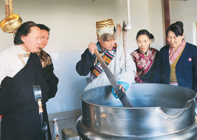 藏醫(yī)藥浴法代表性傳承人明珠(左)指導(dǎo)瀧沐覺(jué)堪(制藥師)煎熬“五味甘露”。關(guān)確才讓攝
