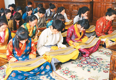 西藏藏醫(yī)學(xué)院的學(xué)生正在研讀記載著藏醫(yī)藥浴法相關(guān)知識(shí)的《四部醫(yī)典》。劉罡攝中國(guó)非物質(zhì)文化遺產(chǎn)保護(hù)中心供圖