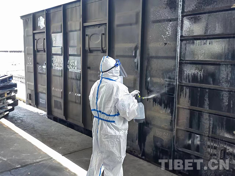 圖為拉薩車務(wù)段工作人員對到站物資進(jìn)行消殺