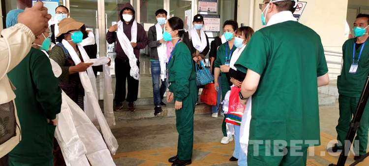 圖為8月18日下午 來自拉薩市方艙醫(yī)院出艙的第二批14名無癥狀感染者與醫(yī)護(hù)人員互獻(xiàn)哈達(dá) 由拉薩市融媒體中心供圖