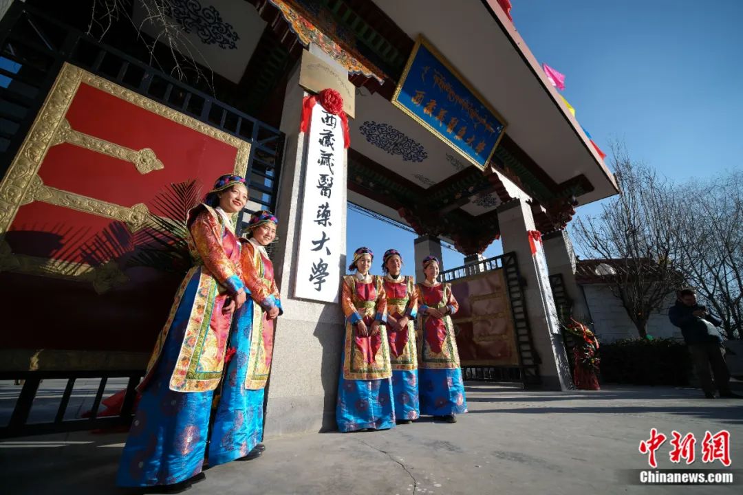 2018年12月28日,西藏藏醫(yī)學院更名為西藏藏醫(yī)藥大學揭牌儀式在拉薩舉行,該校學生在校門前合影留念。何蓬磊 攝