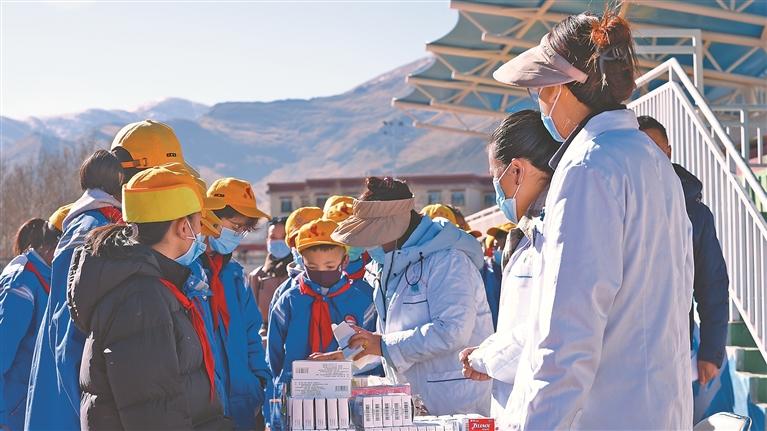 圖為巡診醫(yī)療隊隊員為墨竹工卡縣南京實(shí)驗小學(xué)學(xué)生講解流感預(yù)防知識。記者 格桑倫珠 攝
