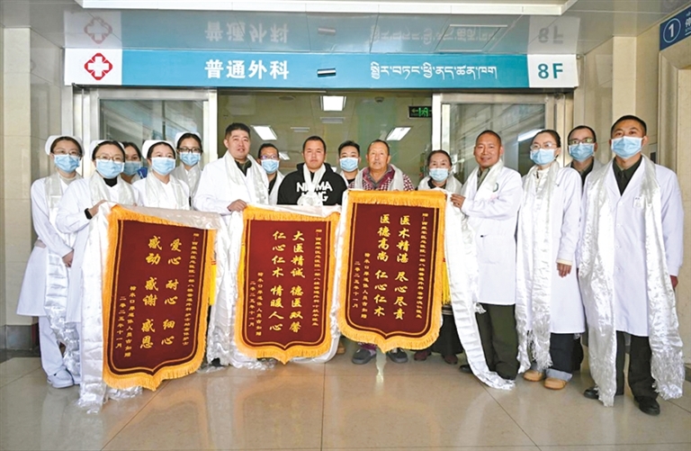 圖為患者出院時(shí)給西藏軍區(qū)總醫(yī)院普通外科醫(yī)療團(tuán)隊(duì)贈(zèng)送錦旗。通訊員 西培多杰 攝