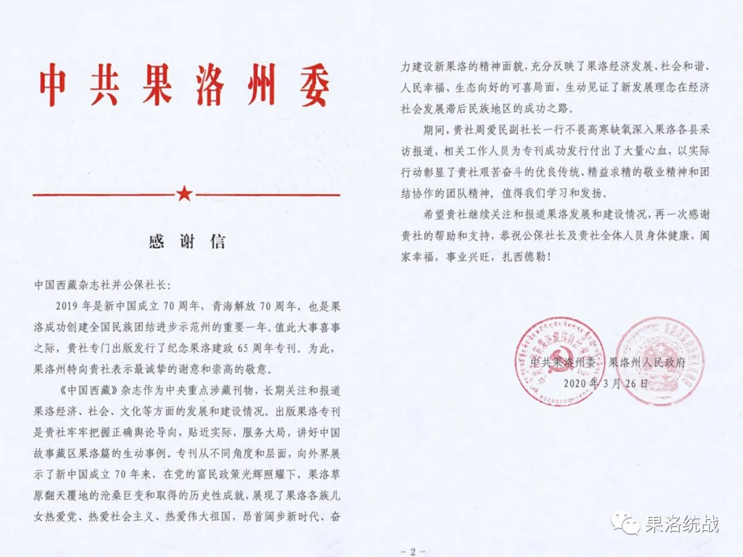 中共果洛州委、州人民政府向中國西藏信息中心致感謝信