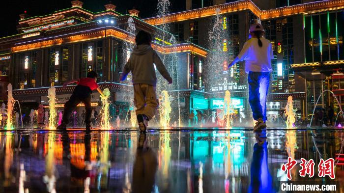 圖為孩子們?cè)诓际胁桉R廣場噴泉附近玩耍。江飛波 攝