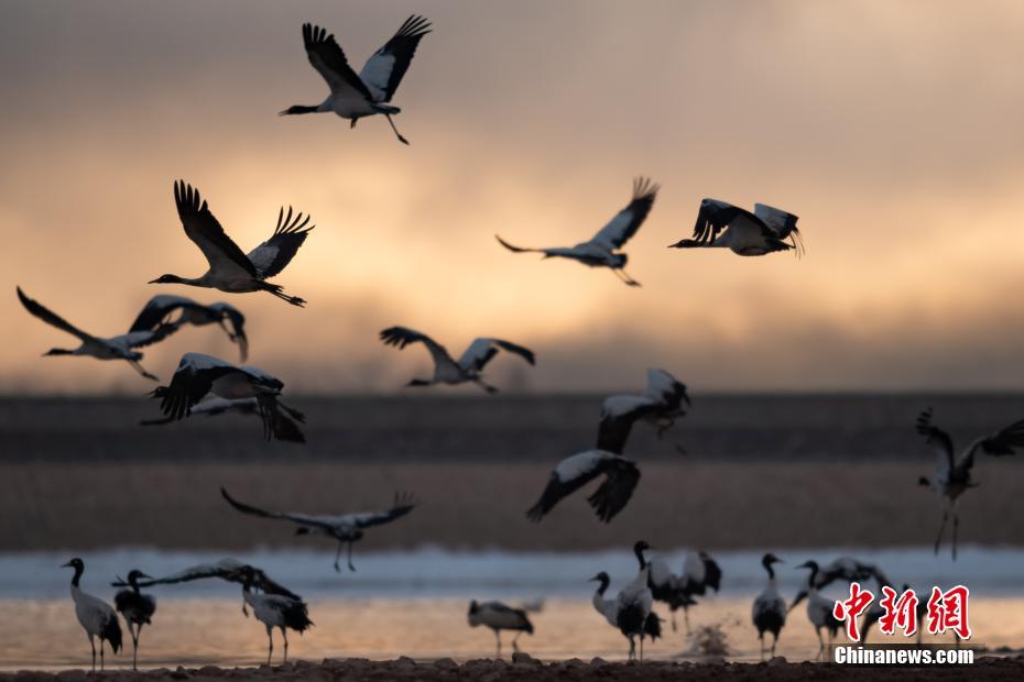 2月17日,西藏拉薩市林周縣黑頸鶴保護區(qū)內(nèi),黑頸鶴翩躚起舞、分外美麗。中新社記者 何蓬磊 攝
