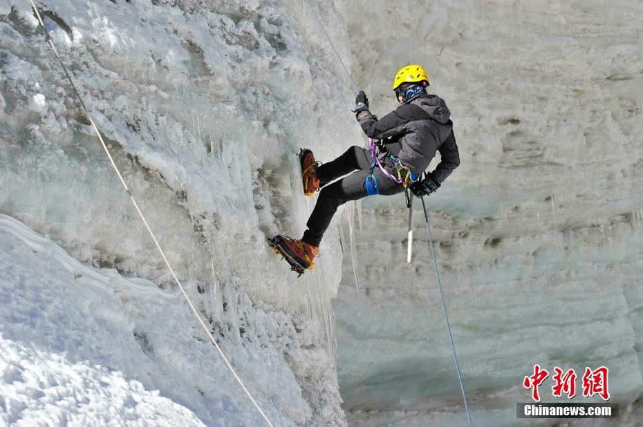 西藏拉薩河谷1號冰川(廓瓊崗日冰川)景區(qū)將與2021年4月正式全面開放,洛堆峰雪山攀登項目也將正式啟動。圖為登山愛好者進行攀登訓練。(資料圖片)中新社發(fā) 貢嘎來松 攝