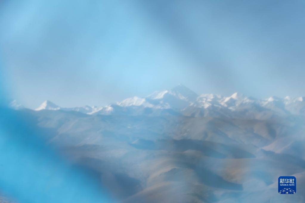 這是3月15日在西藏日喀則透過藍色經(jīng)幡拍攝的珠穆朗瑪峰。新華社記者 周荻瀟 攝