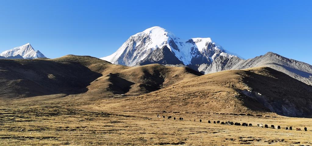 從平緩的草地步入山谷,溪水流下,冰湖上的山峰倒影如夢幻般美麗。目之所及,除了零星經(jīng)過的巖羊和雪雞,唯有肅穆雄偉的山峰;耳之所聞,除了偶爾傳來的冰川融化的碎裂聲外,只余亙古不變常伴耳畔的風(fēng)聲。