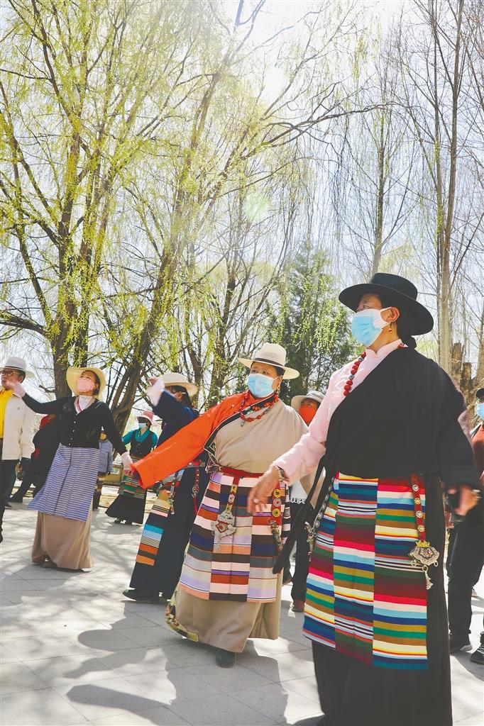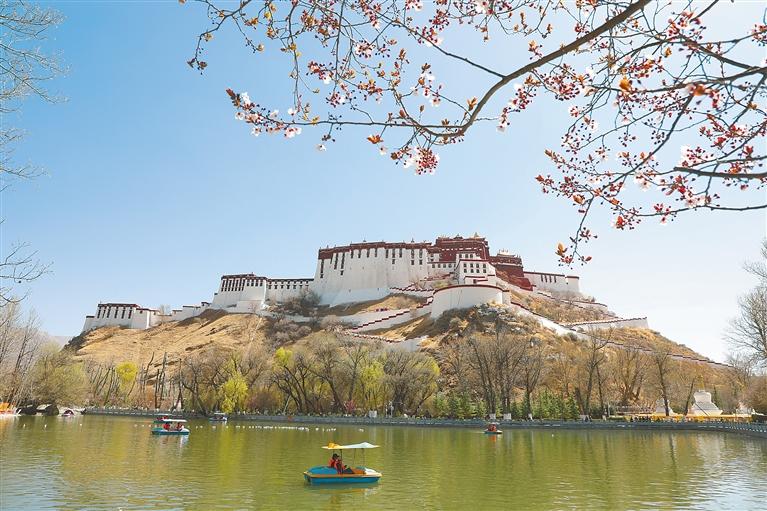 經(jīng)過春意潤染的城市,處處呈現(xiàn)出純凈明朗的美。布達拉宮的金頂反射著耀眼的金光,布達拉宮廣場前綠草茵茵,人工湖旁的垂柳被和煦的春風吹得飄飄揚揚,羅布林卡里的古樹也開始抽出鮮嫩的枝葉,繁華的八廓街上,三五成群的轉(zhuǎn)經(jīng)老人坐在路邊歇息……