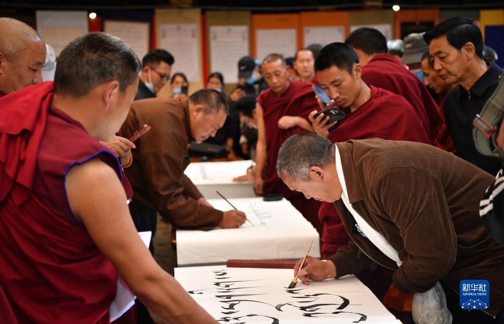4月28日,拉薩大昭寺僧人與書法家切磋技藝。新華社記者 覺果 攝