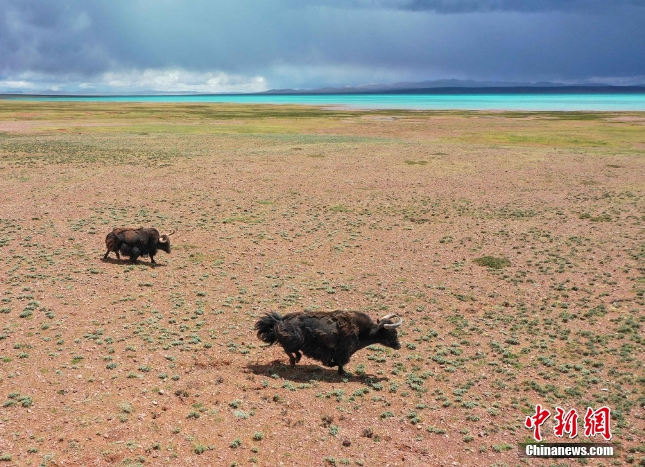 7月16日,西藏那曲羌塘草原上的野牦牛。羌塘草原位于西藏北部,是野生動物的樂園。(無人機(jī)照片) 中新社記者 貢嘎來松 攝