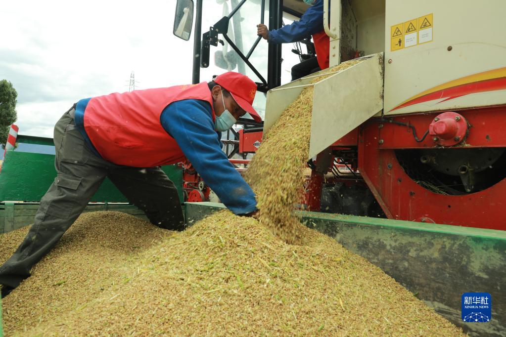 目前,西藏各地進入秋收時節(jié)。西藏拉薩市墨竹工卡縣農民在積極防疫的同時,抓緊收割青稞,確保顆粒歸倉。