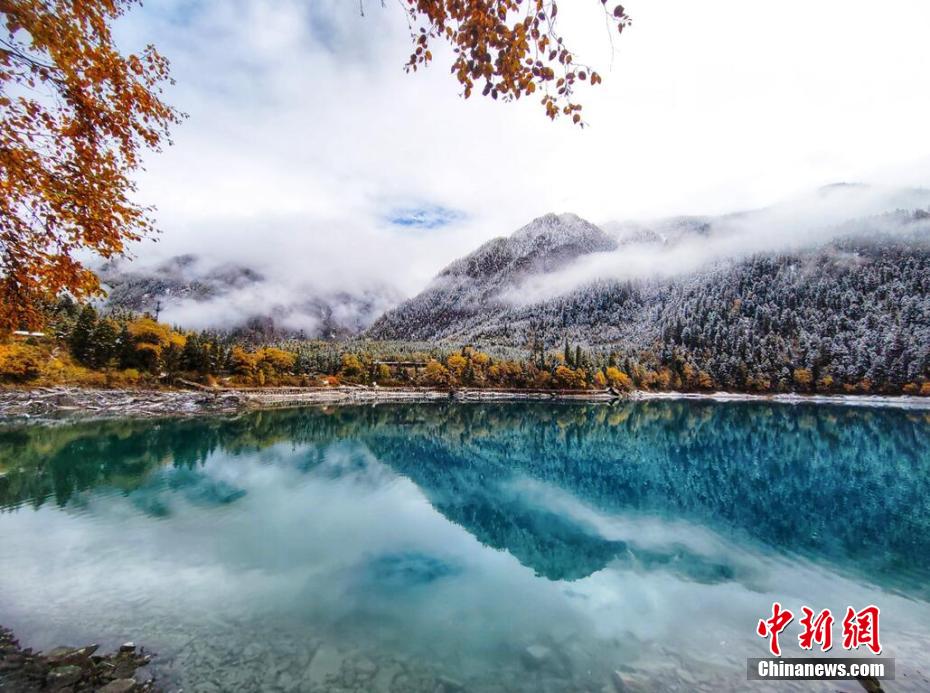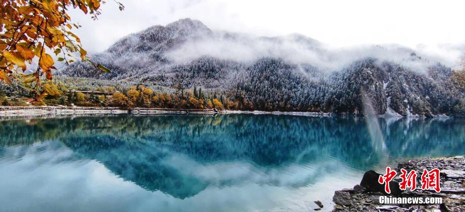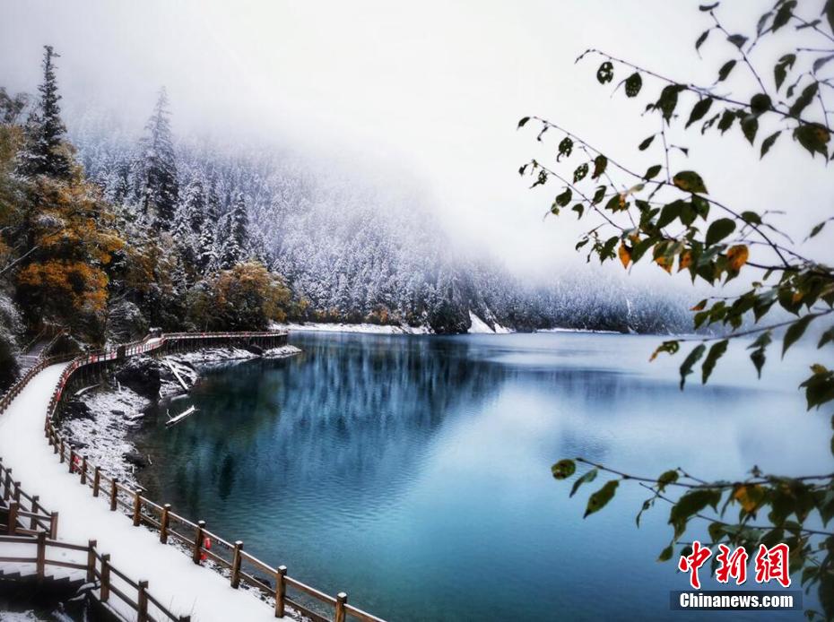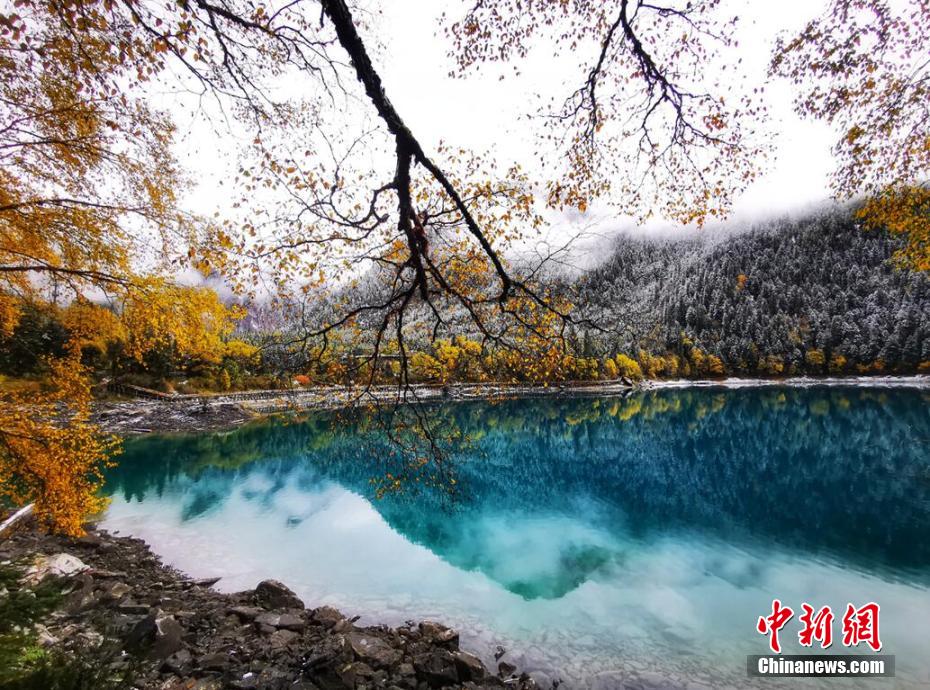 十月,九寨溝長(zhǎng)海、原始森林等景點(diǎn)迎來(lái)入秋后的第一場(chǎng)雪。澄凈碧藍(lán)的海子和金色的彩林與潔白的雪花相映相襯,構(gòu)成一幅靜謐的美麗畫卷。遠(yuǎn)遠(yuǎn)看去,成片的彩林被一朵朵雪花點(diǎn)綴,美得像童話世界一般。 梁峰 攝